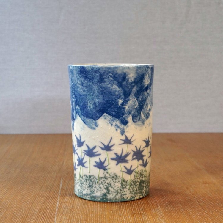 This blue vase was built using a clay slab around a tube and decorated with coloured slip, using a sponge, a trailer and inlay technique.