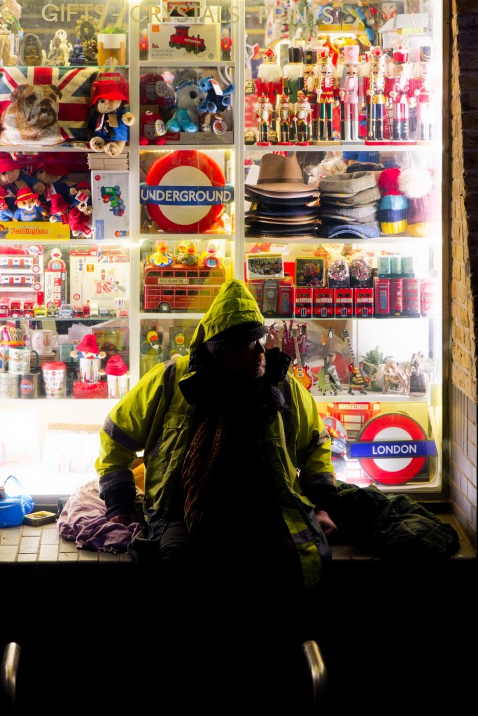 Sadly I saw a homeless man trying to find a comfortable position on the ledge of a souvenir shop. He was bathed in the light coming from the window. There was a poignant contrast between the excessive number of colourful plastic souvenirs and a man trying to accommodate himself with very limited possessions.