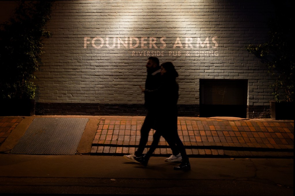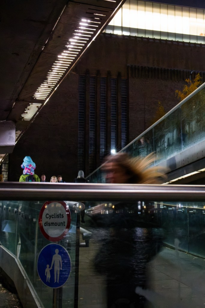 In some parts of the South Bank walk, there were patches of blackness, and I noticed intriguing contrasts between the buildings, signs, and people walking—appearing as if they were being swallowed by their surroundings.