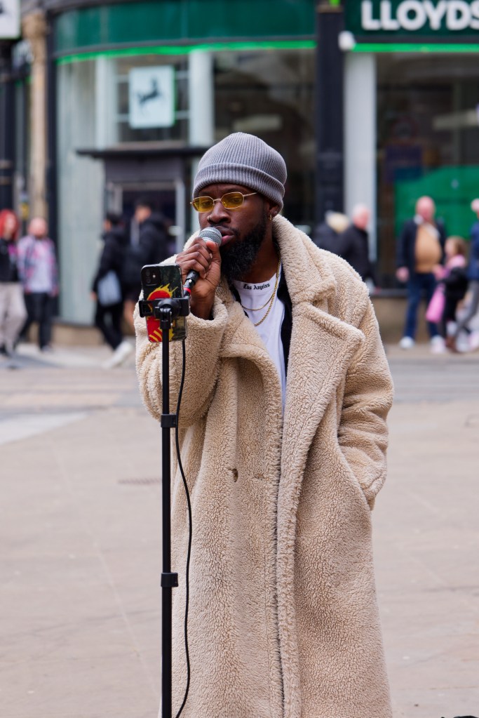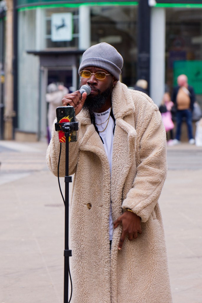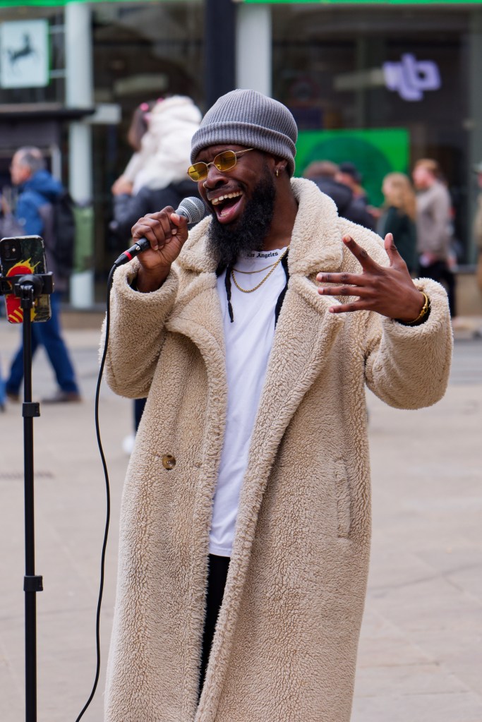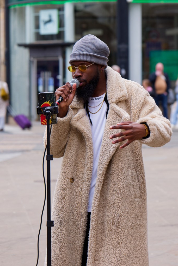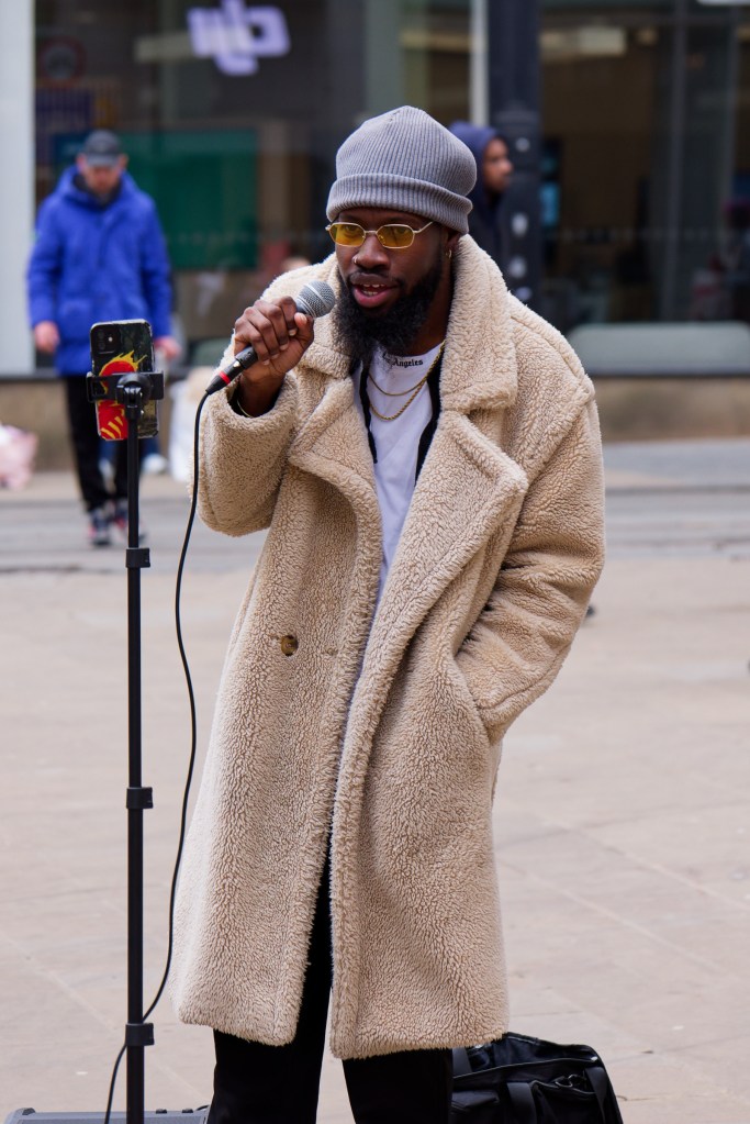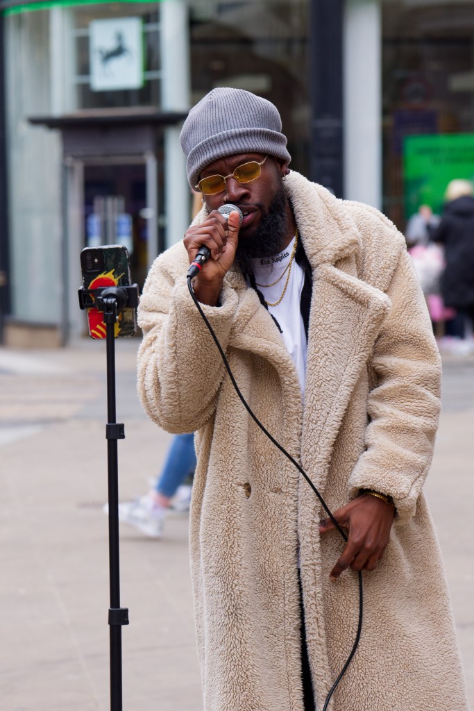 I was drawn to a singer, @jonathanFrancisMusic, performing in the middle of the street. He had a strong voice and a great falsetto. I really enjoyed taking pictures of him while listening to his songs.